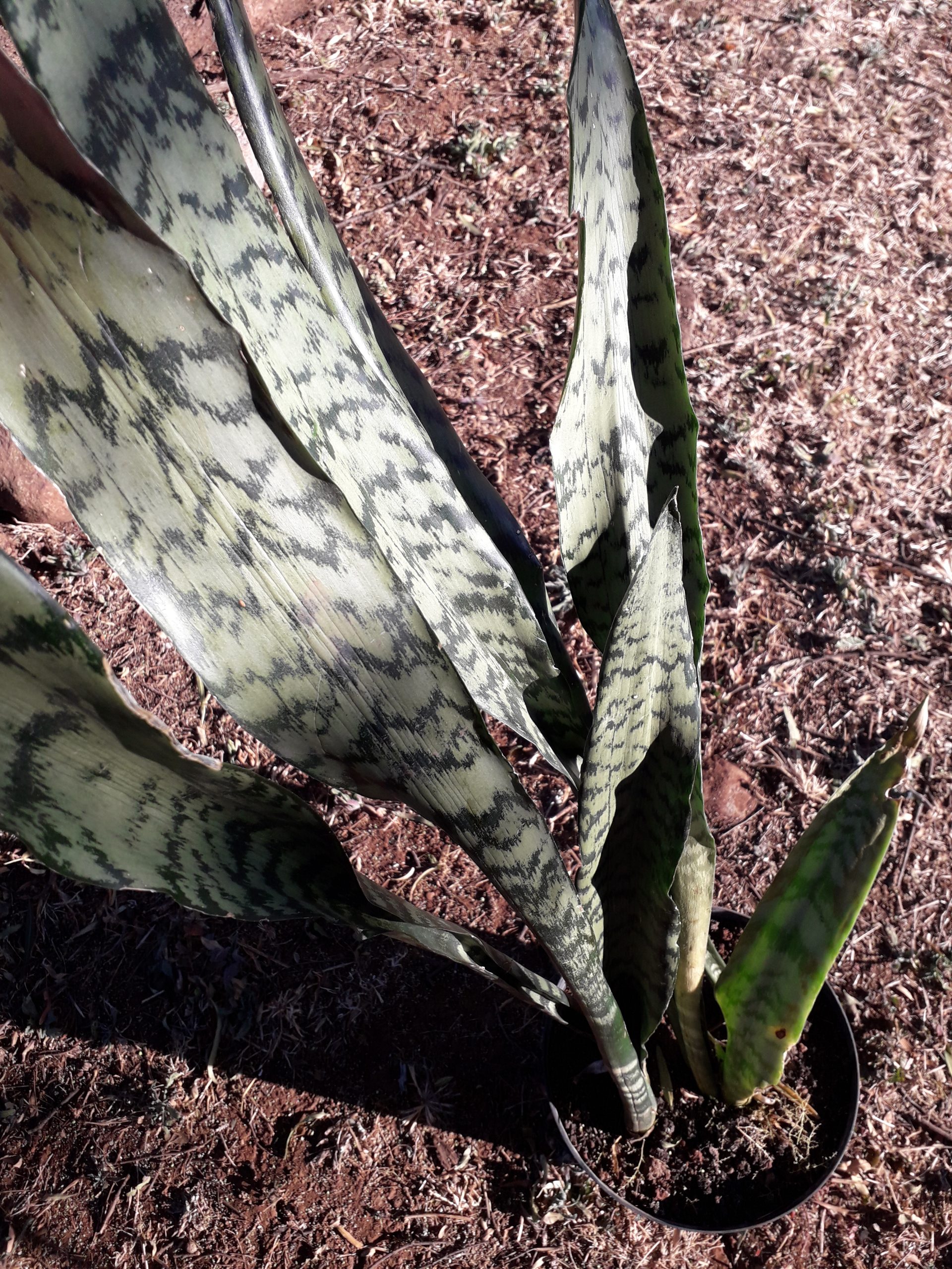 Upright, sword-shaped leaves with variegated green-yellow patterns. Extremely low maintenance.
